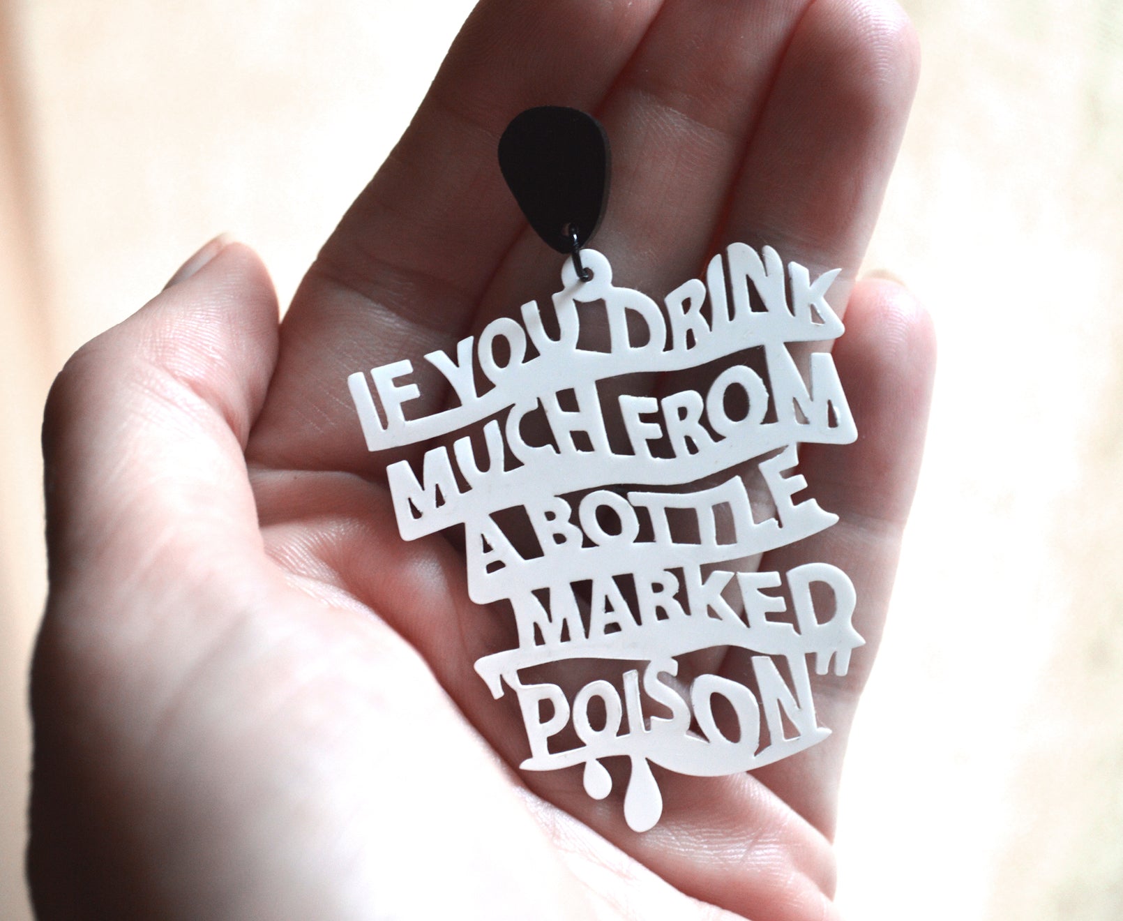 "I'm always blown away by Carroll's originality. That's such a dull way of putting it, but this quote seemed like the perfect opportunity for me to play with something else I love—experimental typography. I enjoyed playing around with distortion of the typeface, the psychedelic look brought the mind-bending quality of the book into this jewelry design."