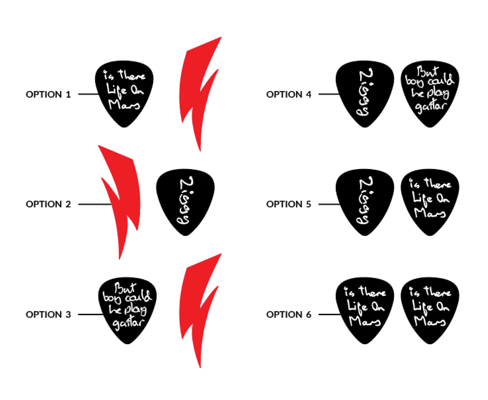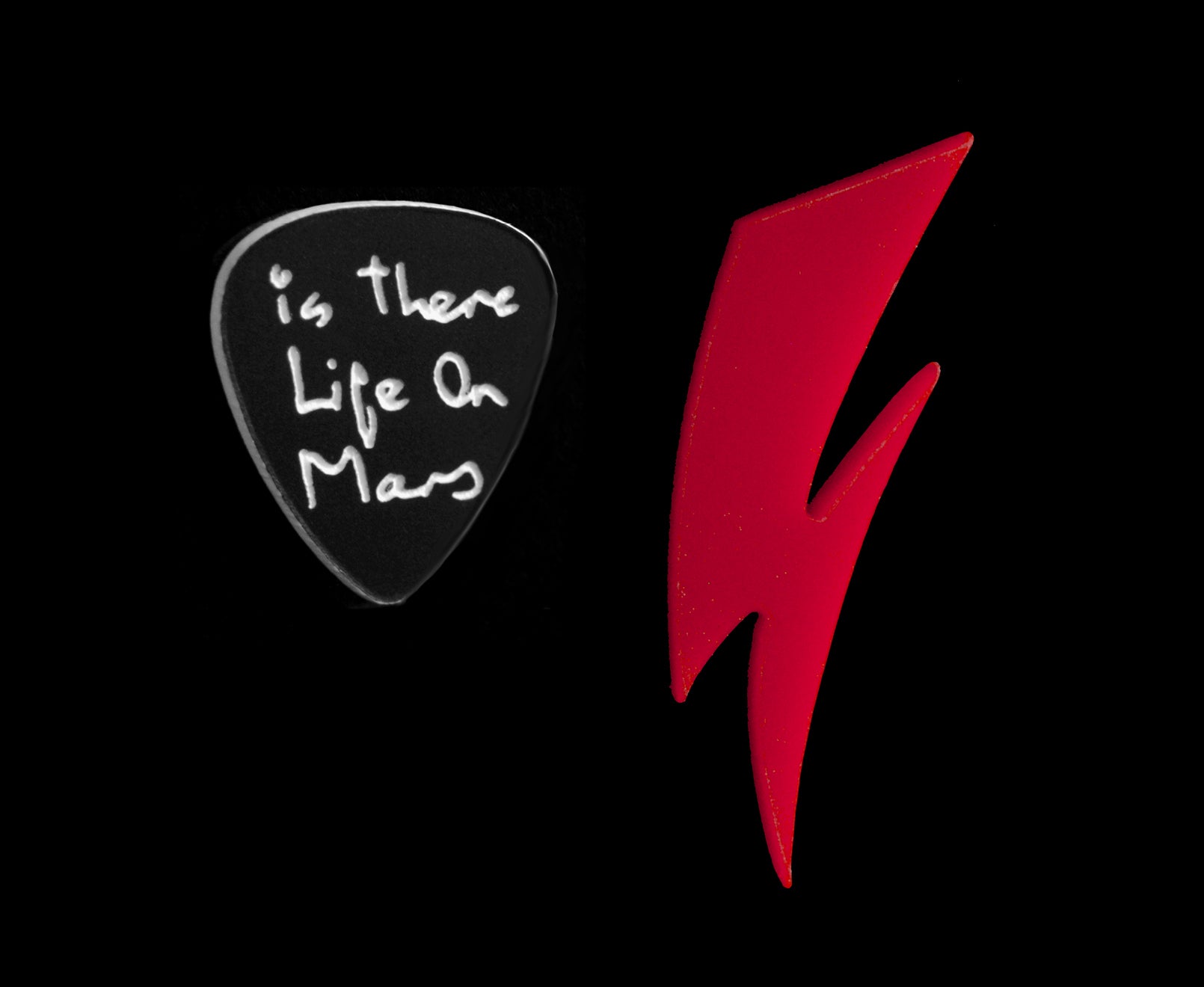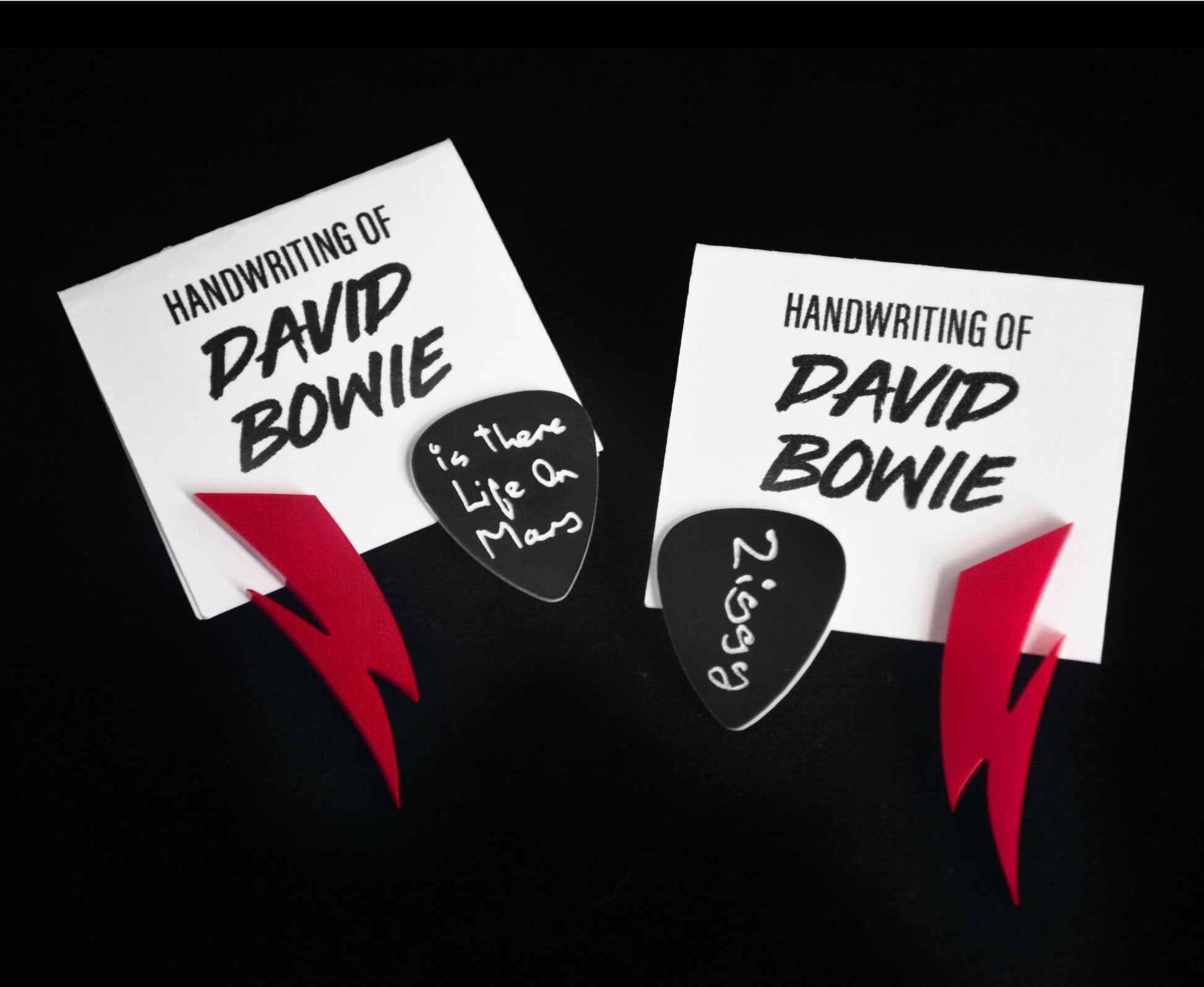 The penmanship of music legend (and gentle soul) David Bowie graces these guitar-pick-shaped earrings. Engraved with lyrics from his handwritten notebooks, there are three versions to choose from:
