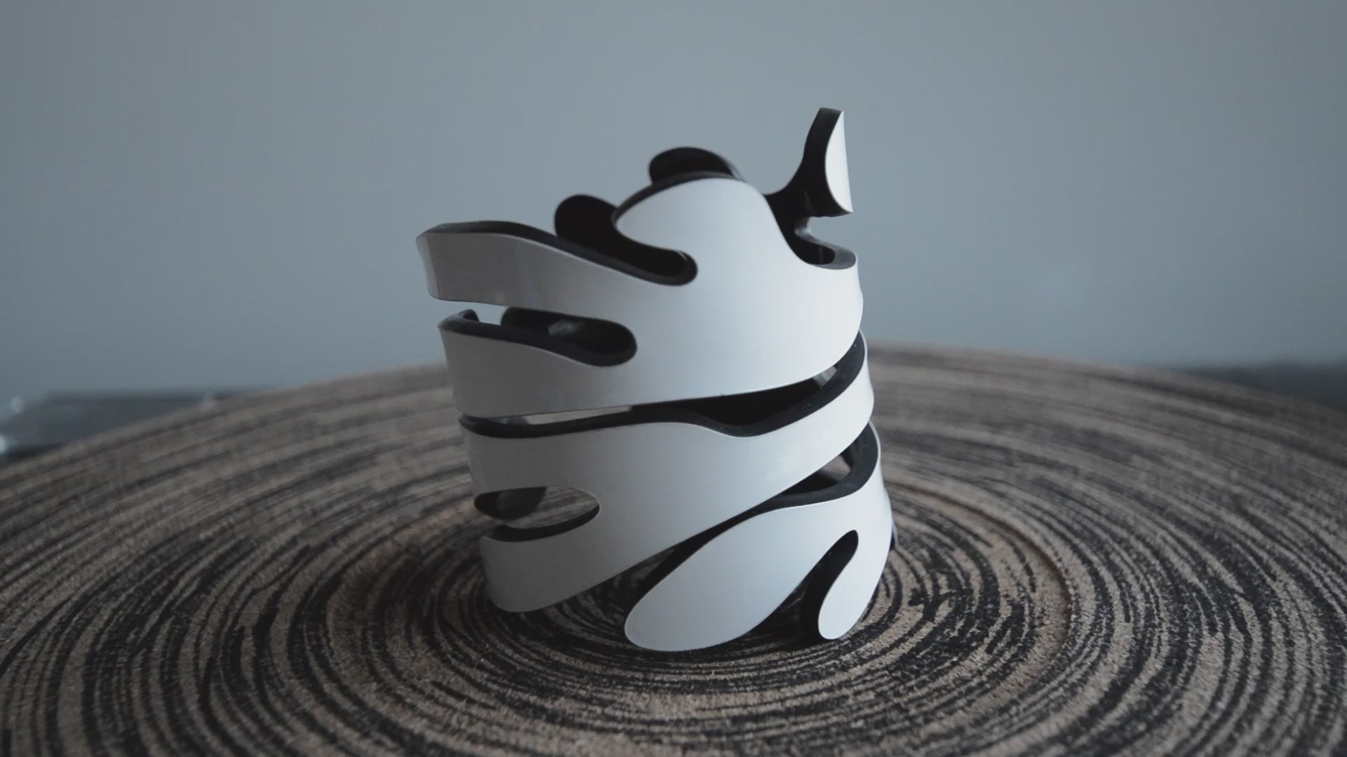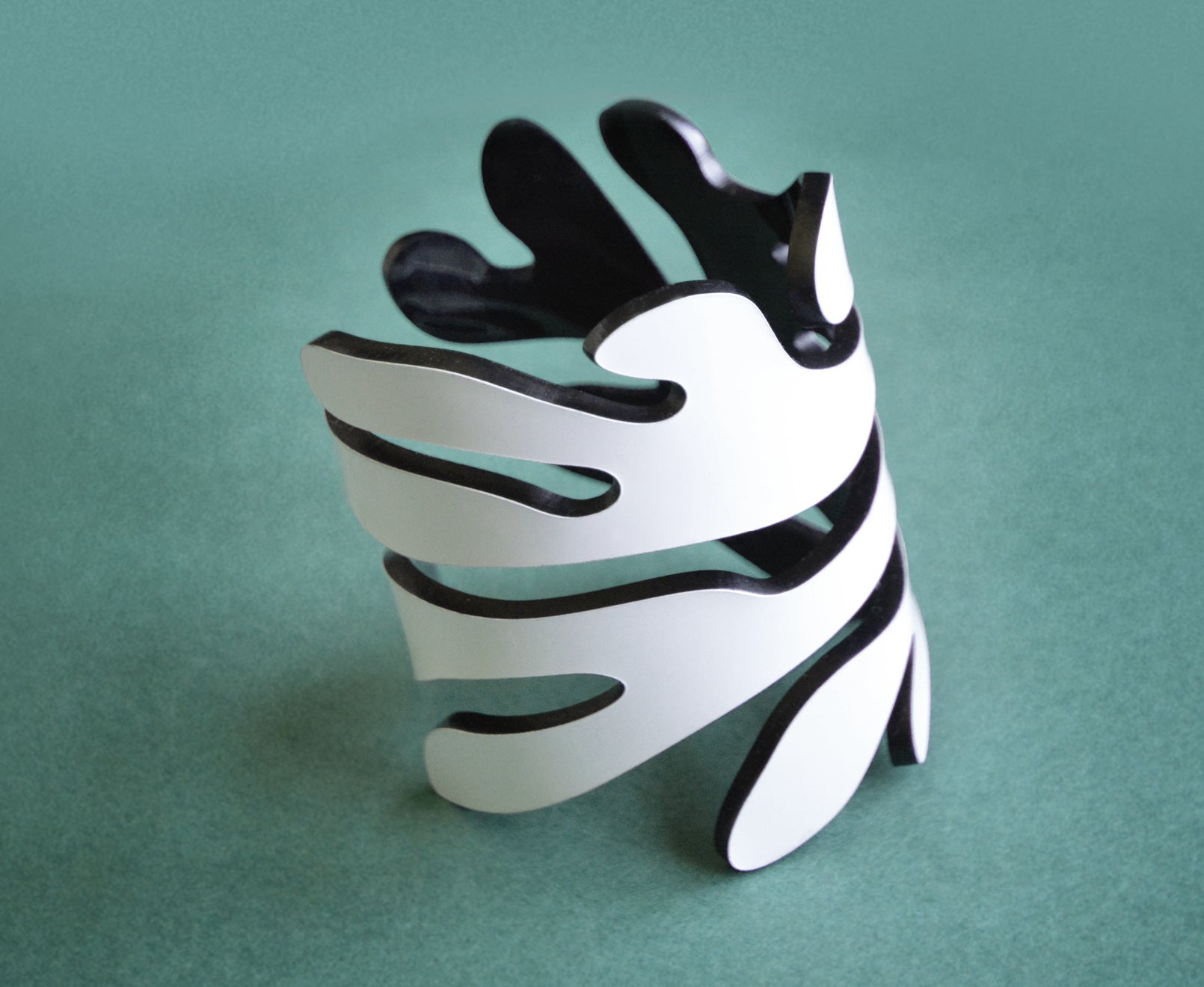 This bracelet wraps the wild, organic shapes of Matisse around your wrist for a super mod look. With a bold graphic quality—in shape and color—this statement piece is hard to miss. The contrasting black edge enhances the bright white hue which promises to pop off of any skin tone. Express your unconventional style with this lightweight bracelet.