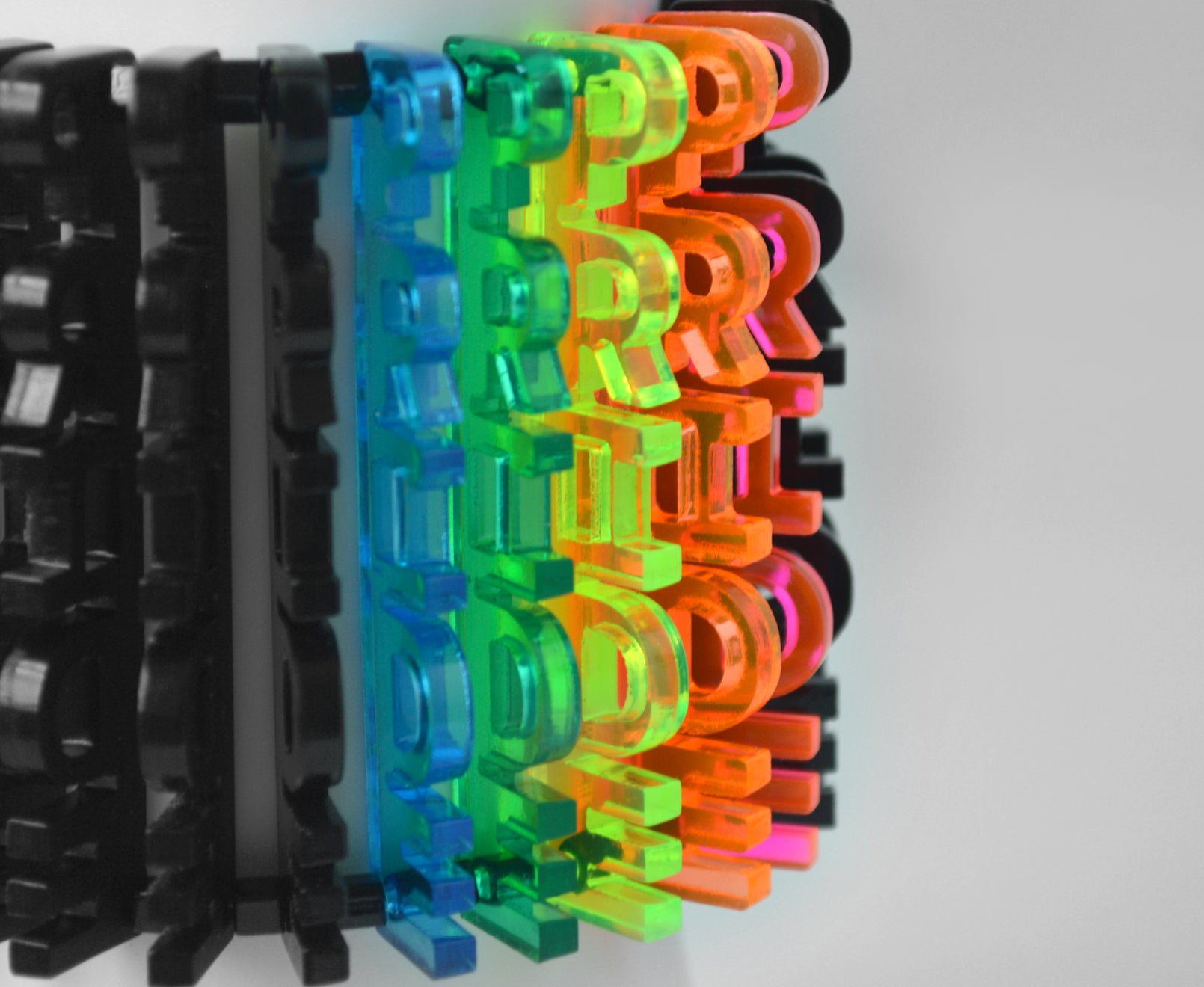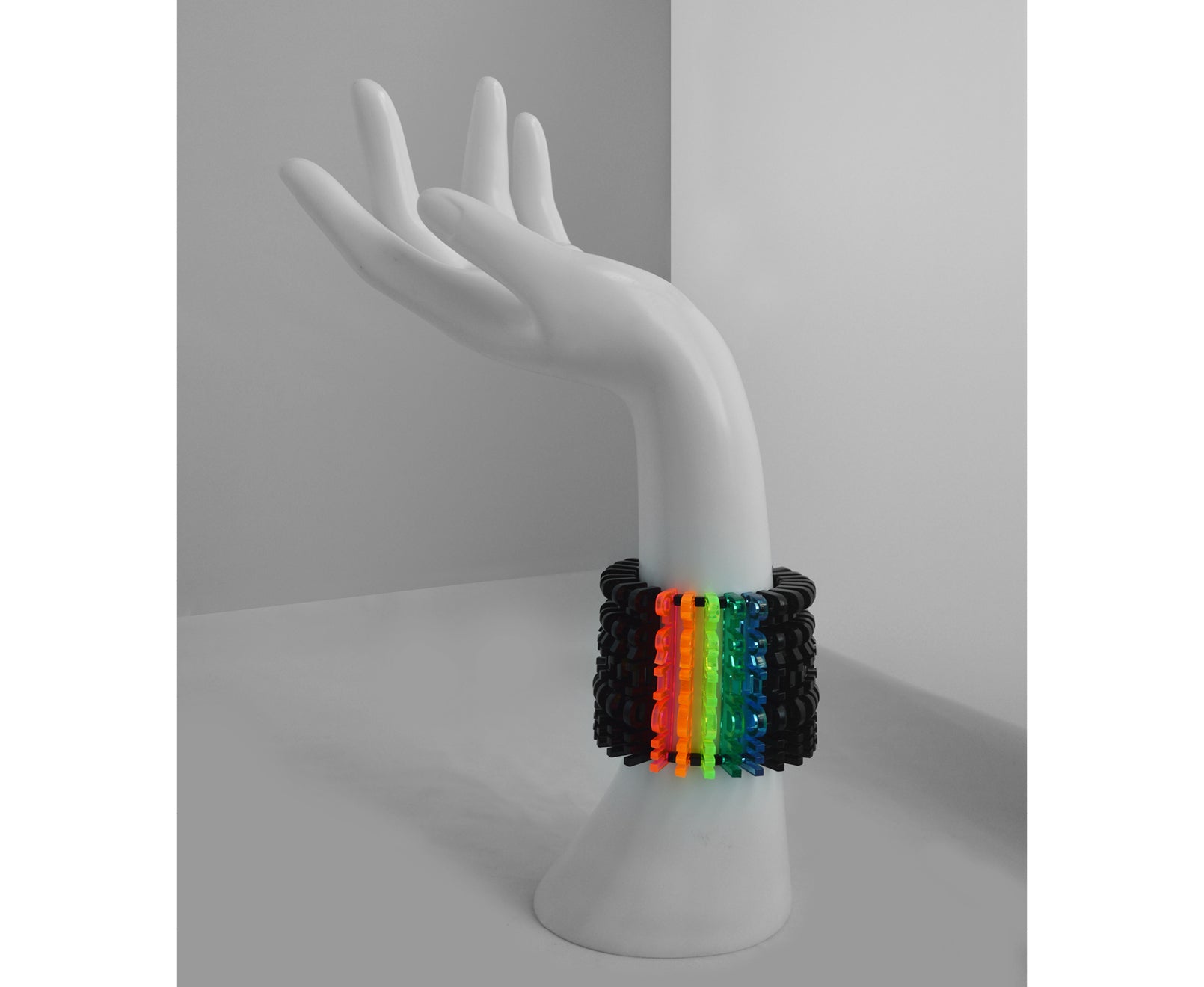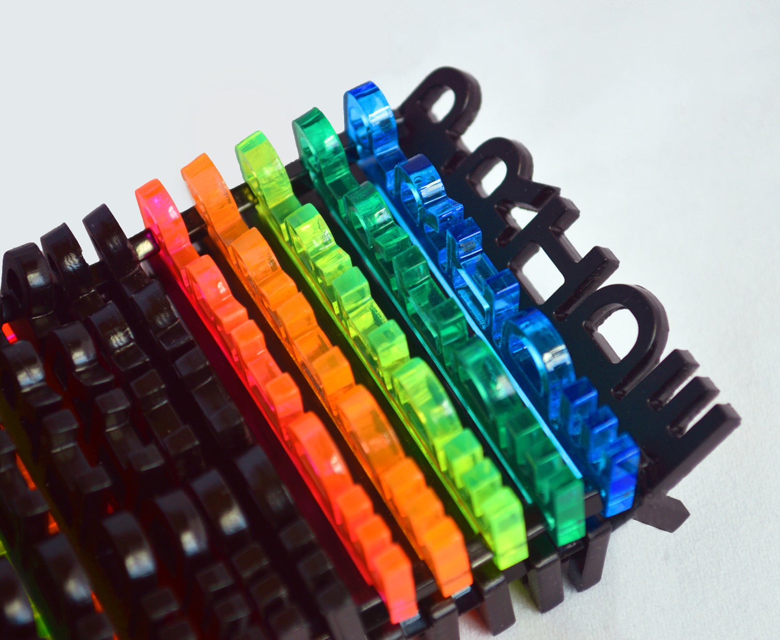 Show your pride and take 'statement piece' to a whole new level with this unique cuff. The word 'pride' is laser cut into a repeating pattern, creating an architectural texture. The rainbow-colored segments are surrounded by black pieces for an edgier design — a slightly subdued take on our full-out rainbow version.