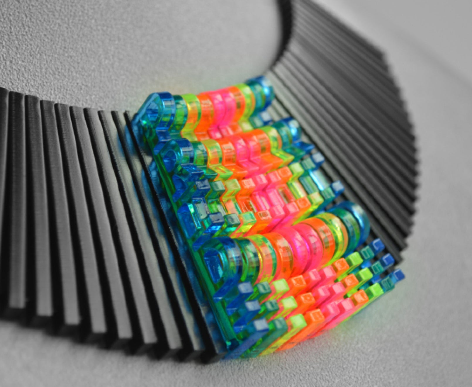 Show your pride while taking 'statement piece' to a whole new level. This unique necklace is made from the word 'pride,' laser cut from neon-colored acrylic, and surrounded by black pieces for a sophisticated design with an edge.