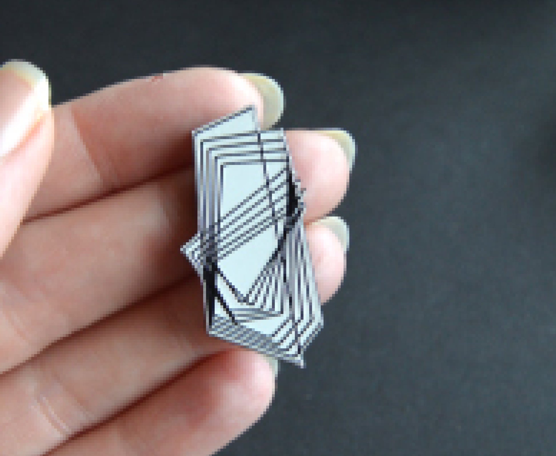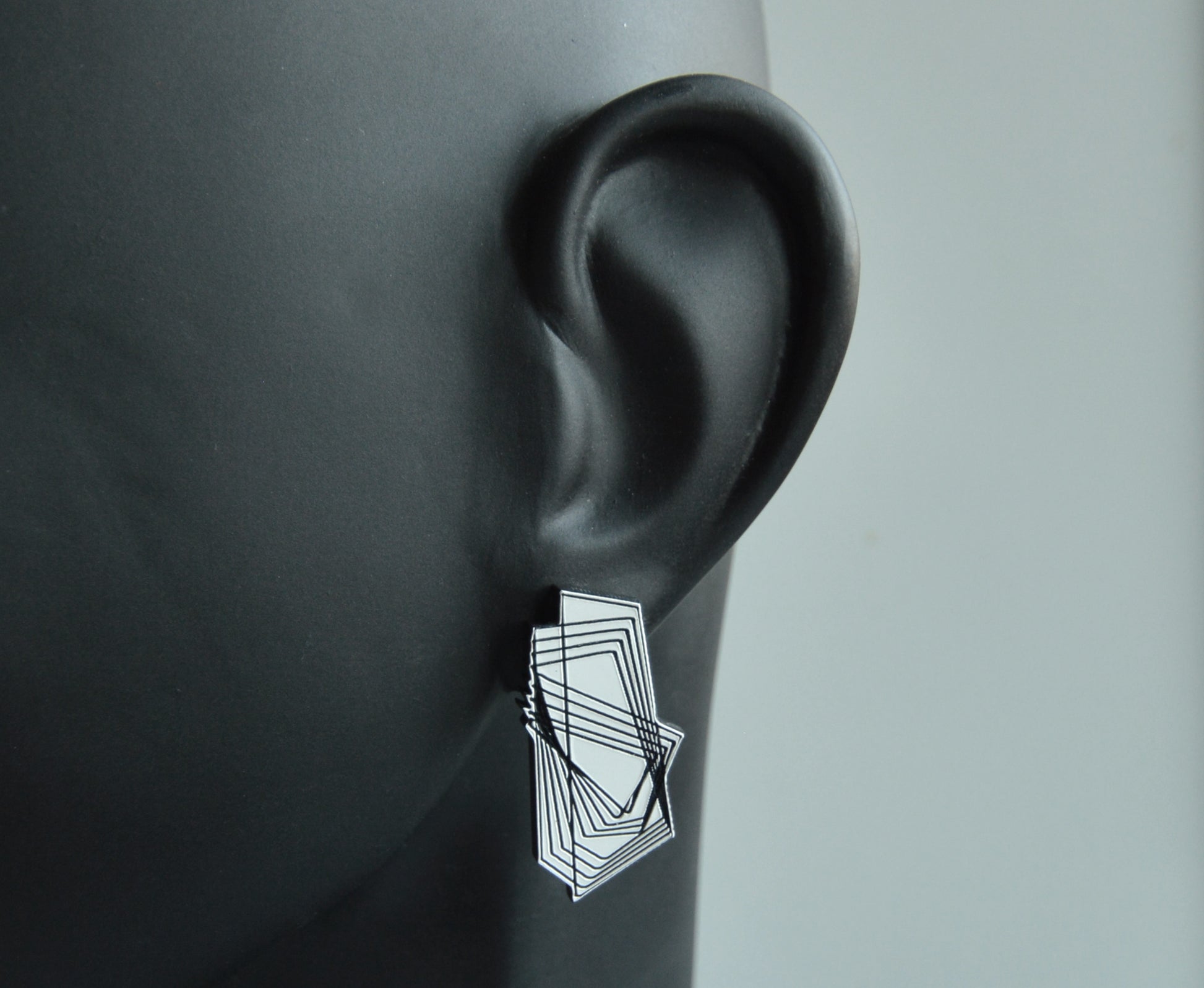 The Ricochet Earrings combine modern architecture with retro imagery of the 1980’s. Set against a crisp white background, these earrings feature a series of black geometric lines that create the illusion of movement. The linear arrangement gives the impression that the lines bounce off an imaginary boundary, mimicking the motion of nostalgic games like “Pong”.